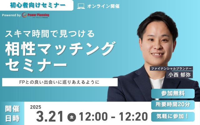 3月21日(金) 12時より、スキマ時間を活用して自分に合ったFPを探すことができる、小西 郁弥講師との「相性マッチングセミナー(無料)」を開催いたします。