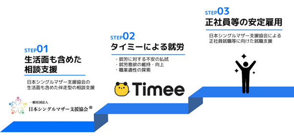 日本シングルマザー支援協会が実施する「MES(ミーズ)採用プログラム※」の中でタイミーを活用し、シングルマザーに対して「就労に対する不安の払拭」、「就労意欲の喚起」、「職業適性の探索」、「強みの発見」などを促し、円滑な正社員等への移行を目指します。