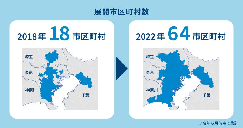 - 展開市区町村18エリアから64エリアまで拡大(2018年6月と2022年6月を比較)