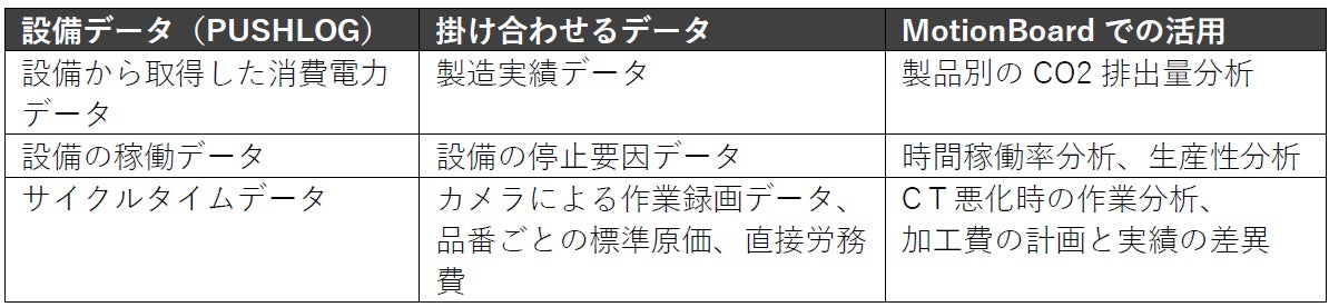 PUSHLOGは、約10分でできる簡単な設定だけで製造業で使用される制御機器などの設備の遠隔監視、データ収集が実現できます。MotionBoardとの連携により設備データのほか、生産管理システムの生産計画数やカメラによる作業録画データ、作業日報などの生産データ等、他システムの多様なデータとかけあわせた可視化やデータ分析ができるようになり、カーボンニュートラルの実現に向けてエネルギーの効率化、生産設備の可視化、ユーティリティ設備の予知保全などが促進できます。