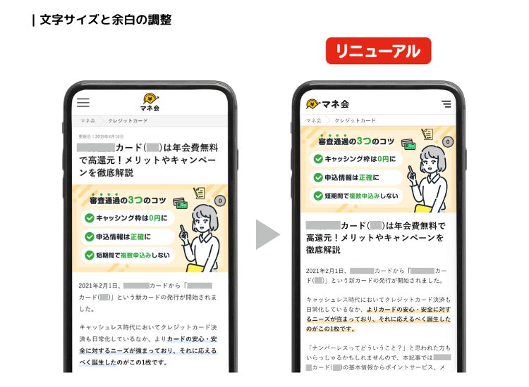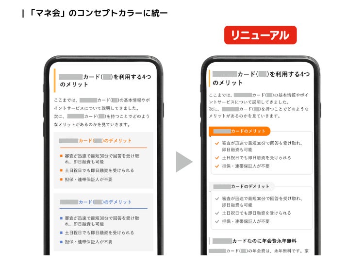 スマートフォンから「マネ会」をご利用いただいているユーザーが増えてきたことを鑑み、スマートフォンからの読みやすさを追求するため、文字サイズと余白の調整をおこないました。また、コンテンツ内の強調箇所に引かれるマーカーの色や、メリット・デメリットを表示する色も「マネ会」のコンセプトカラーに合わせ、サイト全体に統一感を出し、より読みやすい仕様に。