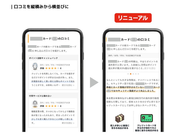 さらに、これまでコンテンツ内に縦積みで配置されていた口コミ情報を横並びに変更したことで、口コミ情報は提供しつつもそれらを必要としていないユーザーの目には入りにくい状態をつくり、ユーザーが必要としている情報に素早くたどり着きやすくなりました。
