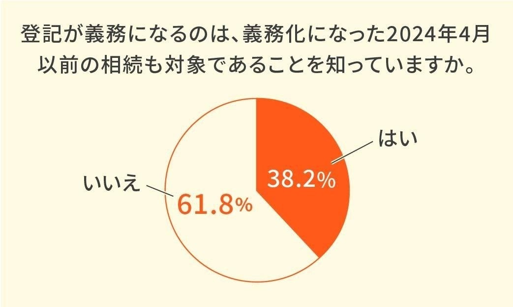 また、相続登記が義務に関して、義務化した2024年4月以前の相続も対象になることについて認知している回答者は38.2%(174人)と、全体の割合に対して低いことがわかりました。