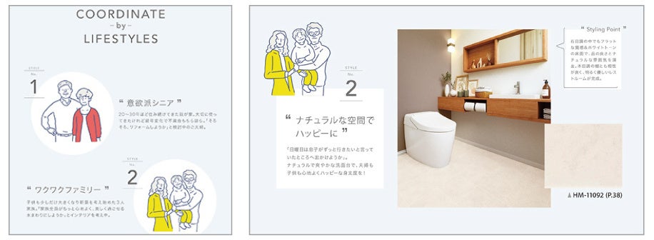 新見本帳では、おすすめのインテリアスタイルごとに商品だけでなく家具や小物を紹介するほか、イラストを使用し、インテリア雑誌のように商品を楽しく選ぶことができる構成に刷新。エンドユーザーの “自分好みの空間づくり” をサポートする見本帳を目指しました。