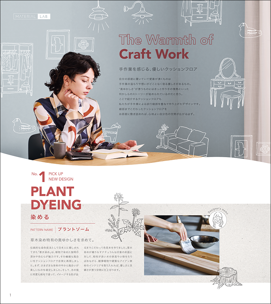 商品ラインアップでは、近年住宅での使用が増えている 2.3mm厚クッションフロアのラインアップを拡充。デザイン面では、「染める」「削る」「重ねる」といった手作業ならではのぬくもりを丁寧に再現した巻頭企画「マテリアルラボ」をはじめ、人気の木目や石目でもニュアンスカラーを多数収録し、使いやすいカラーバリエーションにこだわったコレクションです。