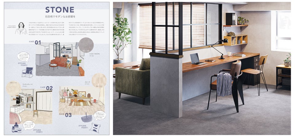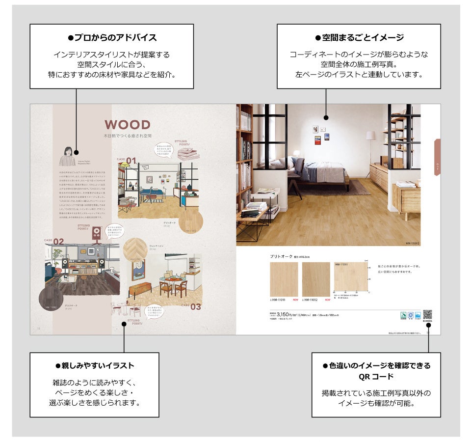 「WOOD」「STONE」「PLAIN&PATTERN」の各カテゴリ扉では、インテリアスタイリストが提案する空間スタイルにおすすめの商品だけではなく、スタイリングのポイントとなる家具や小物もイラストとともに紹介します。また、各商品の施工例写真は、従来の床にフォーカスした写真から、暮らしやコーディネートのイメージが膨らむような空間全体の写真に変更したほか、色違いを含めた全商品の施工例写真が確認できるQRコードを新たに掲載しました。