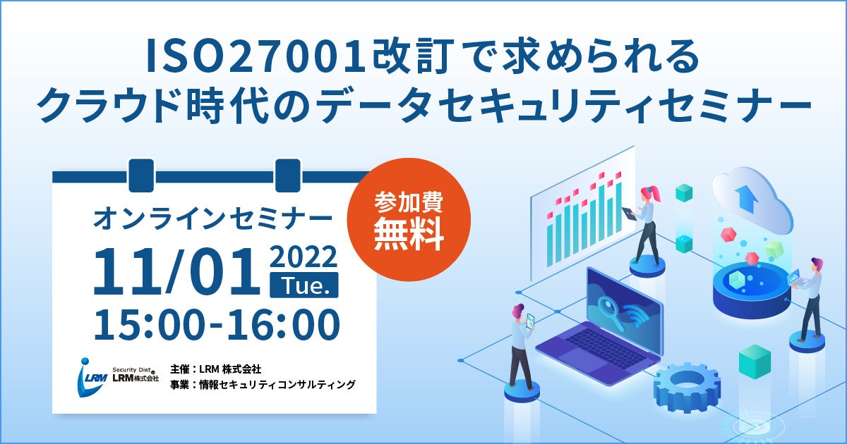 LRM株式会社(以下 LRM、本社:兵庫県神⼾市、代表取締役CEO:幸松哲也)は、「ISO27001改訂で求められるクラウド時代のデータセキュリティセミナー」を11⽉1⽇(月)15時から開催いたします。クラウド移行・運用管理などのサービスを提供するAvePoint Japan株式会社(以下AvePoint Japan、本社:東京都港区、代表取締役:塩光献)と共に、ISO27001改訂の変更点や対応すべき事項の解説、クラウドサービスにおけるセキュリティ対策についてご紹介します。Zoomでの無料オンラインセミナーですので、ぜひお気軽にご参加ください。