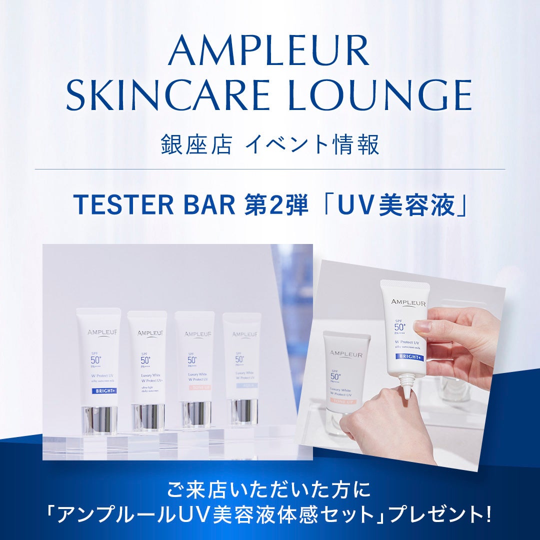 期間中「AMPLEUR SKINCARE LOUNGE 銀座店」にご来店いただいたすべての方に、TESTER BARでご紹介している“4つの日焼け止め美容液“のサンプルパウチセットをプレゼントいたします。