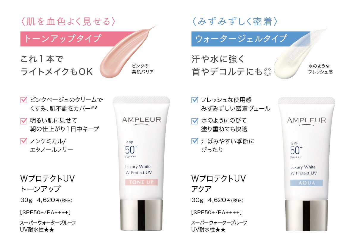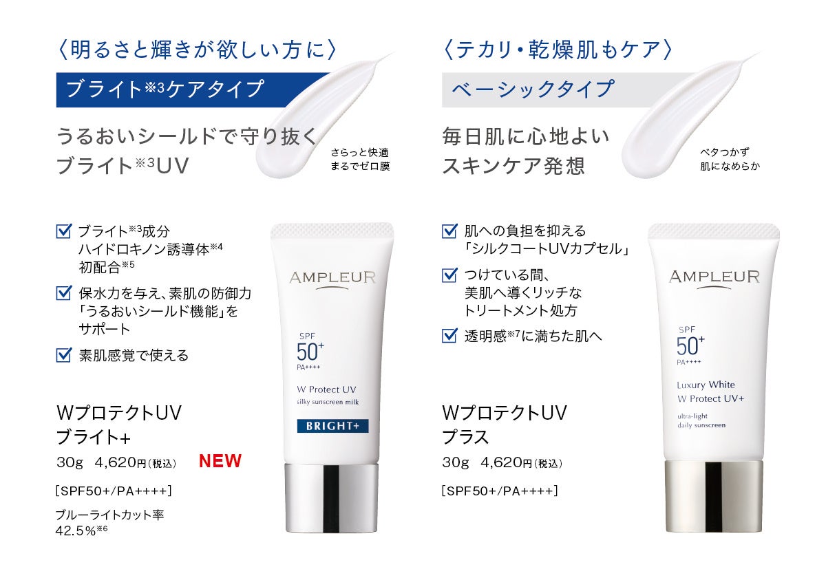 2024年3月1日(金)に発売したばかりの新製品「WプロテクトUV ブライト+」は、ブライト成分※3を配合し、素肌の防御力「うるおいシールド機能」をプラスし、夏でも絶対日焼けしたくない、白肌を目指したい、紫外線ダメージを回避したいといった方におすすめです。