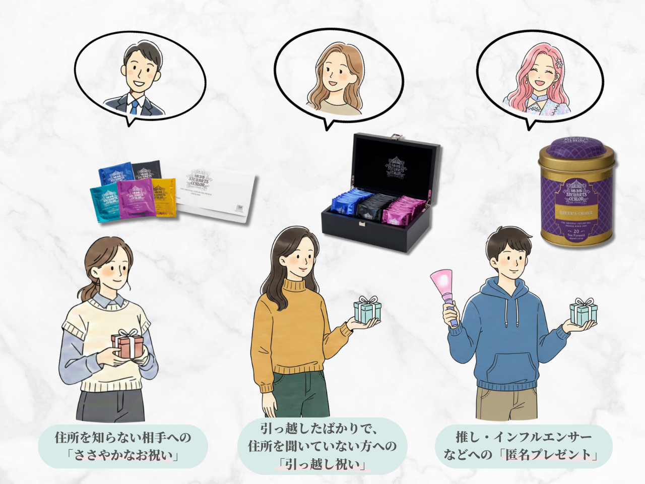 A. はい、可能です。配送伝票の送り主様欄には「George Steuart Tea 公式通販 eギフト部」と記載され、贈り主様の個人情報は記載されません。SNSで知り合ったご友人などへも安心してお贈りいただけます。