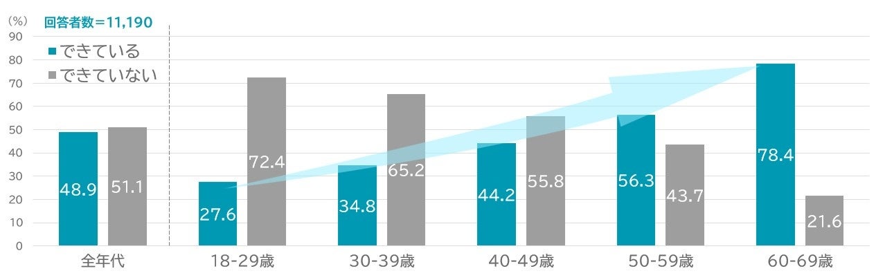 *「できている」=「「ねんきん定期便」や「ねんきんネット」の試算などで、おおよそイメージできている」、「年金事務所に相談・確認して、おおよそイメージできている」、「FP(フィナンシャルプランナー)や金融機関など第三者に相談して、おおよそイメージできている」、「新聞やテレビ、インターネットの報道・ニュースなどで、世の中の平均的な年金受給額は理解している」のいずれか、「できていない」=「受給する年金の種類くらいはわかるが、金額まではイメージできない」、「金額もわからないし、受給する年金の種類もわからない」、「わからない、答えたくない」のいずれか