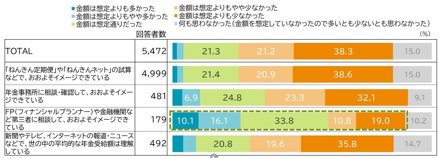 受給額をイメージできている人について、把握手段別に受給額に対する感想が異なる傾向を示すことが分かりました。「ねんきん定期便」や「ねんきんネット」の試算などで把握した人や、新聞・テレビなどの情報源から把握した人は、概ね「少ない」との感想に偏っています。一方、FPや金融機関などの第三者に相談して把握した人は、「金額は想定通りだった」との感想が最も多く、想定とのギャップが小さかったことがうかがえます【図表3】。