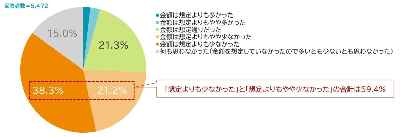 受給額をイメージできている人に受給額の感想を尋ねたところ、金額が「想定よりも少なかった/やや少なかった」と感じる方の割合が高いことが分かりました【図表2】。