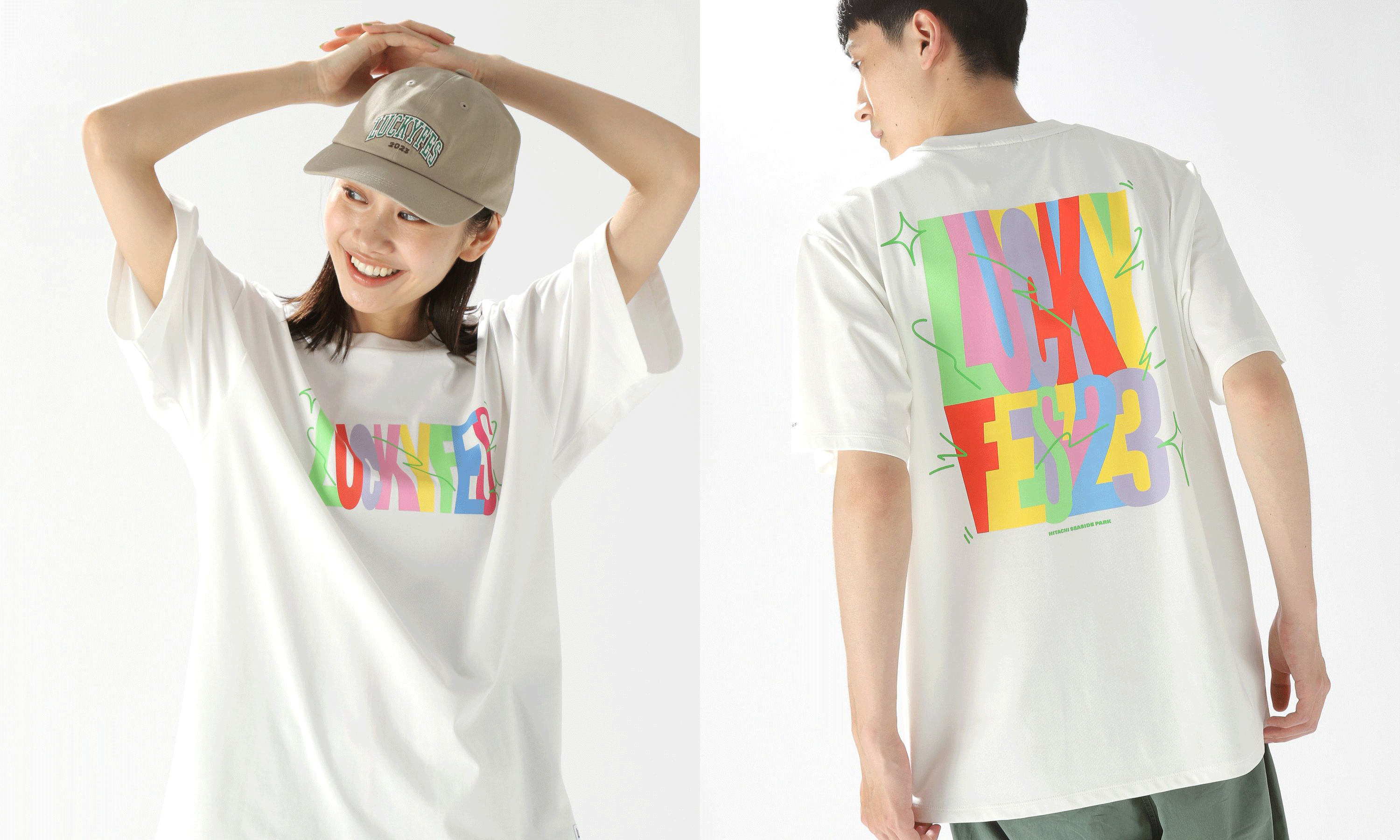 今年はTシャツ、タオル、キャップなど屋外フェスに欠かせないアイテムに、クロスオーバーを掲げ「音楽と食とアートの祭典」をテーマとする多様性に富んだLuckyFesのイメージを表現した多彩でオリジナルなグラフィック、フェスらしいカラフルなカラーでデザイン。イベント当日の気分を盛り上げるだけでなく、その後の生活の中で何度でも思い出をシェアしていただけるよう、年代性別を問わないタウンユースを意識したグッズをラインアップしています。