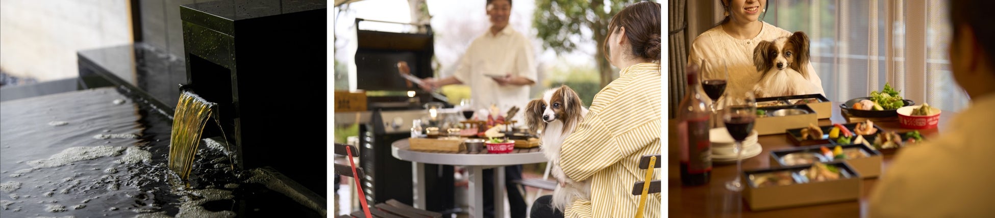 ご夕食・ご朝食とも、愛犬と一緒にお部屋にてご用意しているため、気兼ねすることなくプライベートな空間で快適にお過ごしいただけます。夕食は、インルームダイニングで房総の旬を堪能できる会席御膳プランか、プライベートテラスでのBBQプランをお選びいただけます。