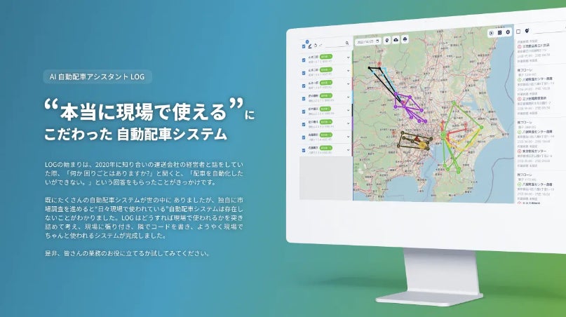 『AI自動配車アシスタント LOG』は、運送会社が日々行っている配車管理・配送計画作成業務をAIで自動化するシステムです。