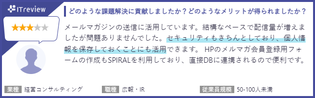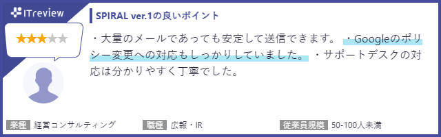 このたび頂戴したユーザー様コメントでは、「セキュリティもきちんとしており、個人情報を保存しておくことにも活用できます」、「Googleのポリシー変更への対応もしっかりしていました」、「低コストで脱エクセルからの業務改善をするには、スパイラルはひとつの検討対象として良いと思います。基本的にはインターネット上に公開されているため、社内外(海外含む)で活用できます」など、当社のセキュリティ体制やGoogleの送信ガイドラインへの対応方針(※1)、システムの費用面および利便性に対するご評価をいただきました。