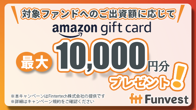 また、本ファンドへの出資額に応じて最大10,000円分のAmazonギフトカードをプレゼントするキャンペーンを併せて実施いたします。