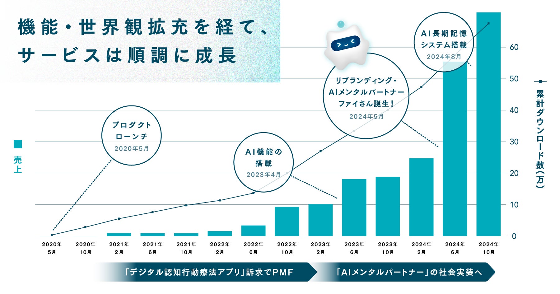 弊社が提供するAIメンタルパートナーアプリ「アウェアファイ」は、2020年のサービスリリース以降、機能アップデートやリブランディングを経て順調に成長してまいりました。