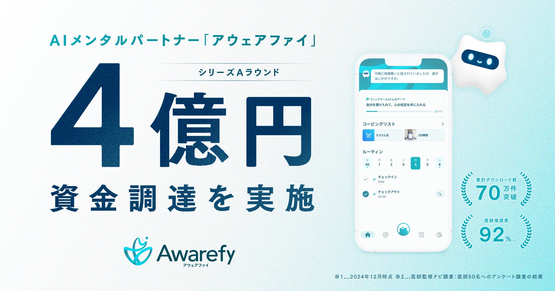 AIメンタルパートナー「アウェアファイ」、シリーズAラウンドで4億円の資金調達を実施