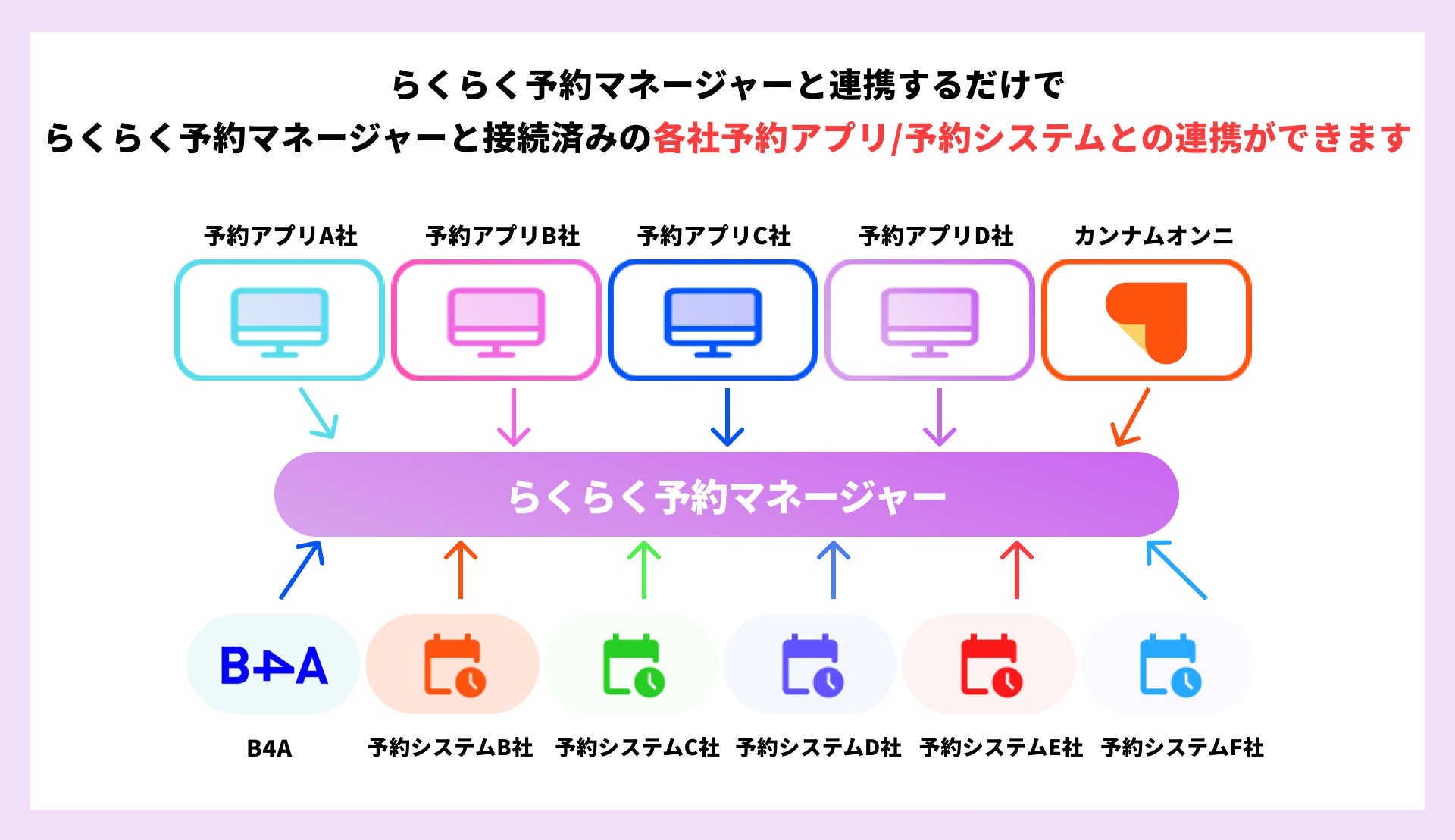 予約アプリや予約システム各社は、らくらく予約マネージャーと連携するだけで、らくらく予約マネージャーと接続済みの他の予約アプリや予約システムとも自動的に連携できます。