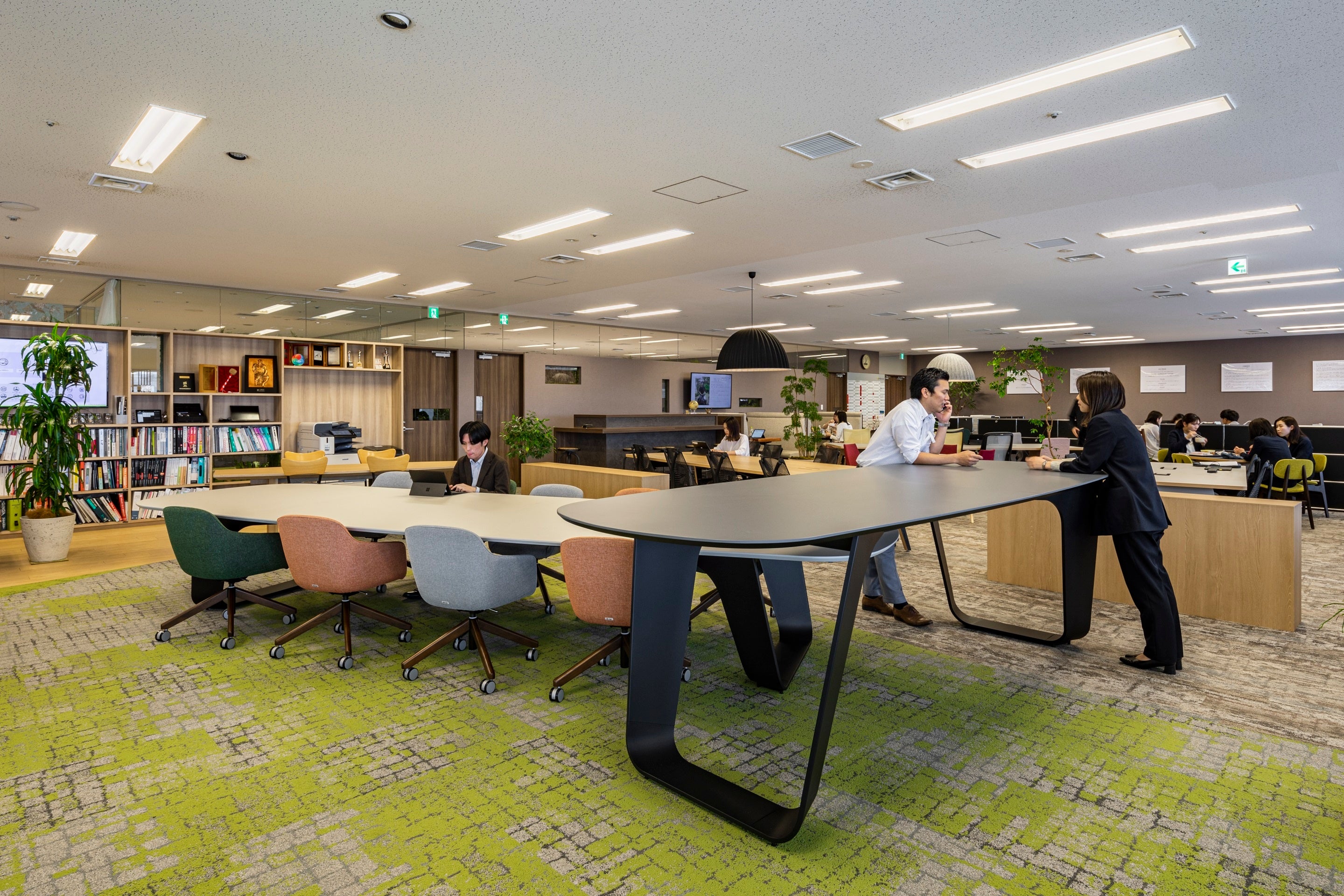部署が交わるスペースには柔軟に使用できコラボレーションしやすいデスクを置き、プロジェクトごとのmtgがすぐにしやすい環境をつくりました。