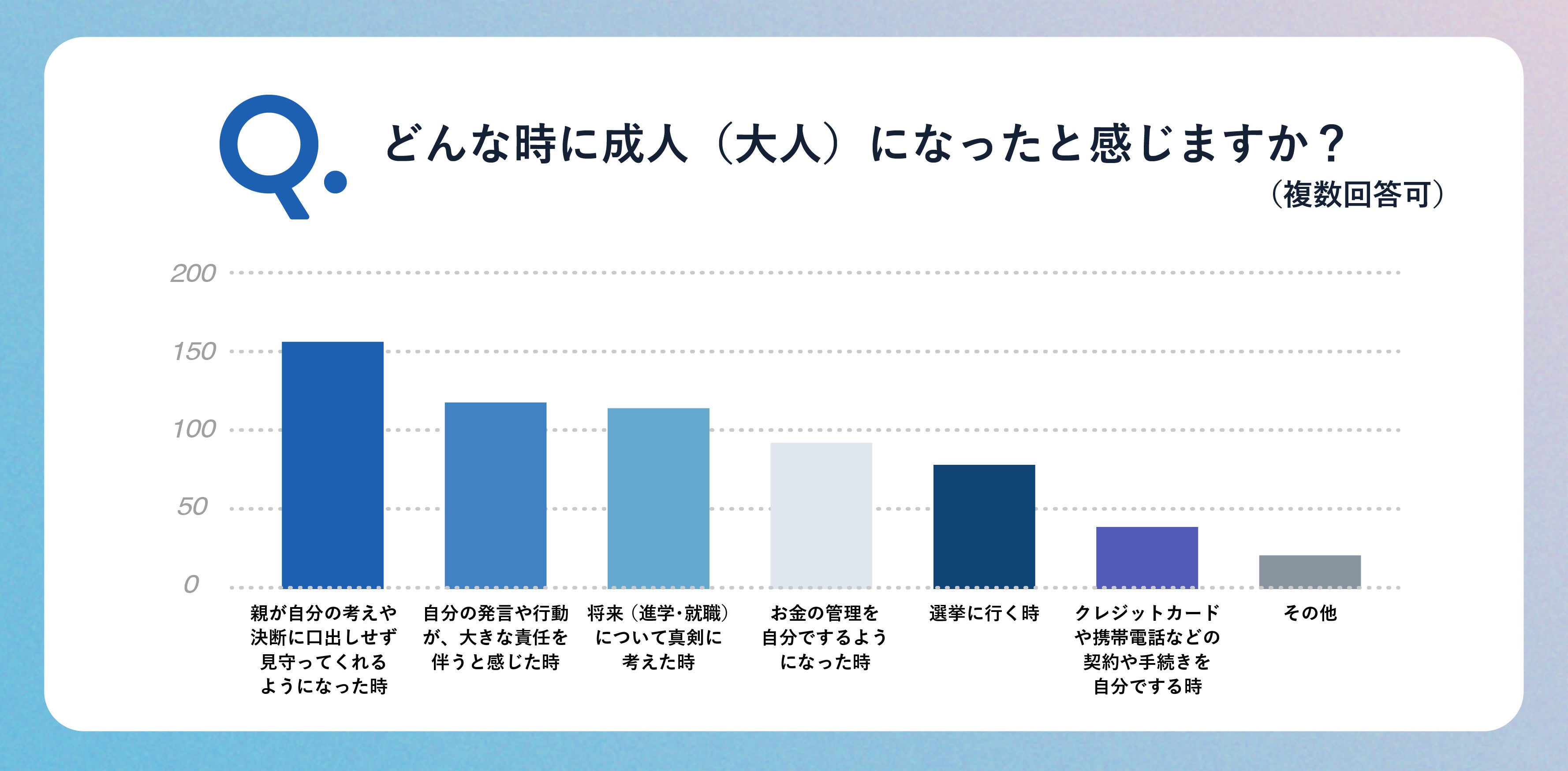 自身の将来(進学・就職)について真剣に考える場面や、選挙に行くといった、責任や権利を担う場面で、成人になることを実感するという声が多く集まりました。