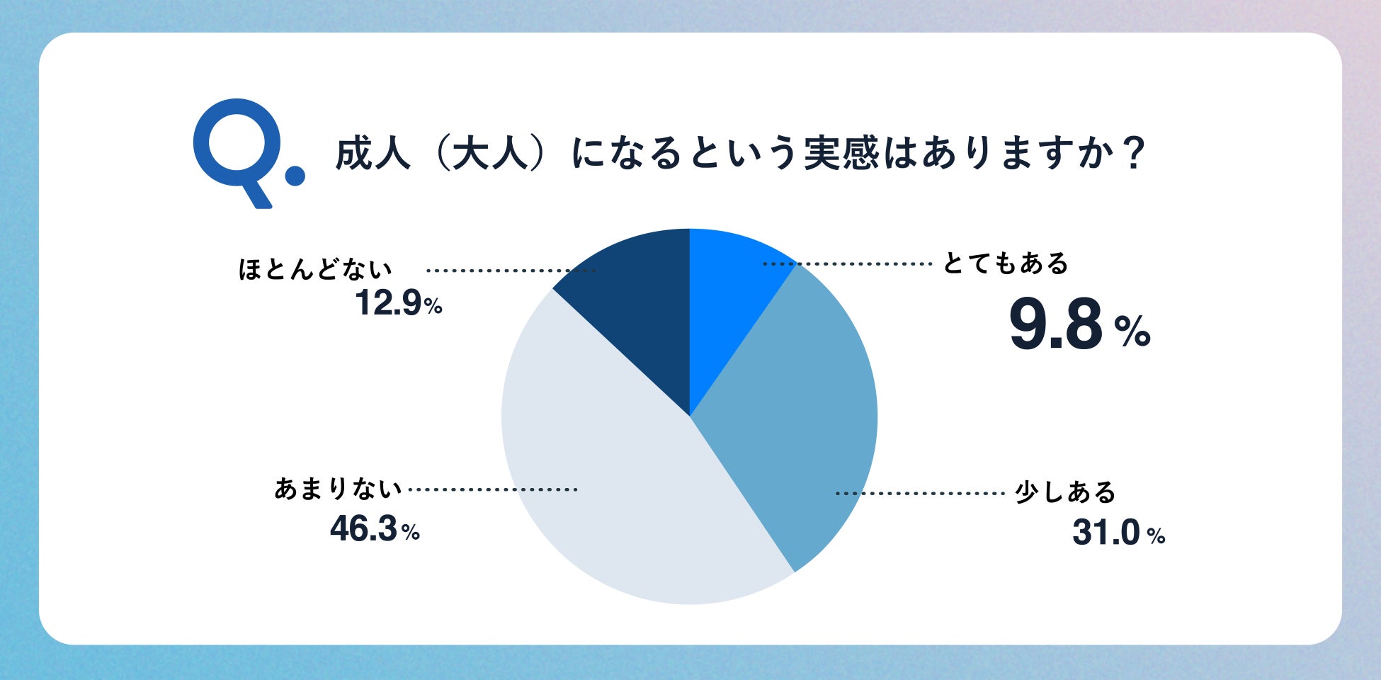 大人になる実感があると回答したのは全体の約4割と半数を切った。特に、進学や就職など将来のことについて考える場面で、大人になることを実感するという意見が多くみられた