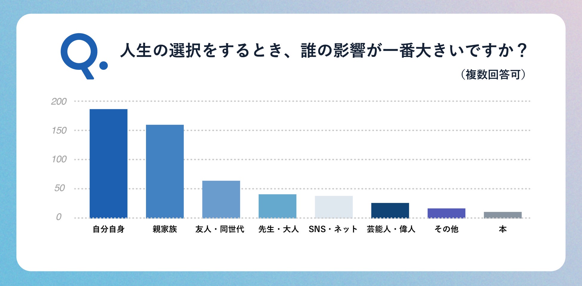 また、人生の選択をする際に影響を受けた人物について、親や家族の影響も受けることも多くある一方、「自分自身」との回答が最も多く、自分の価値観や自己決定を大切にしている傾向が強いことがわかる結果となりました。