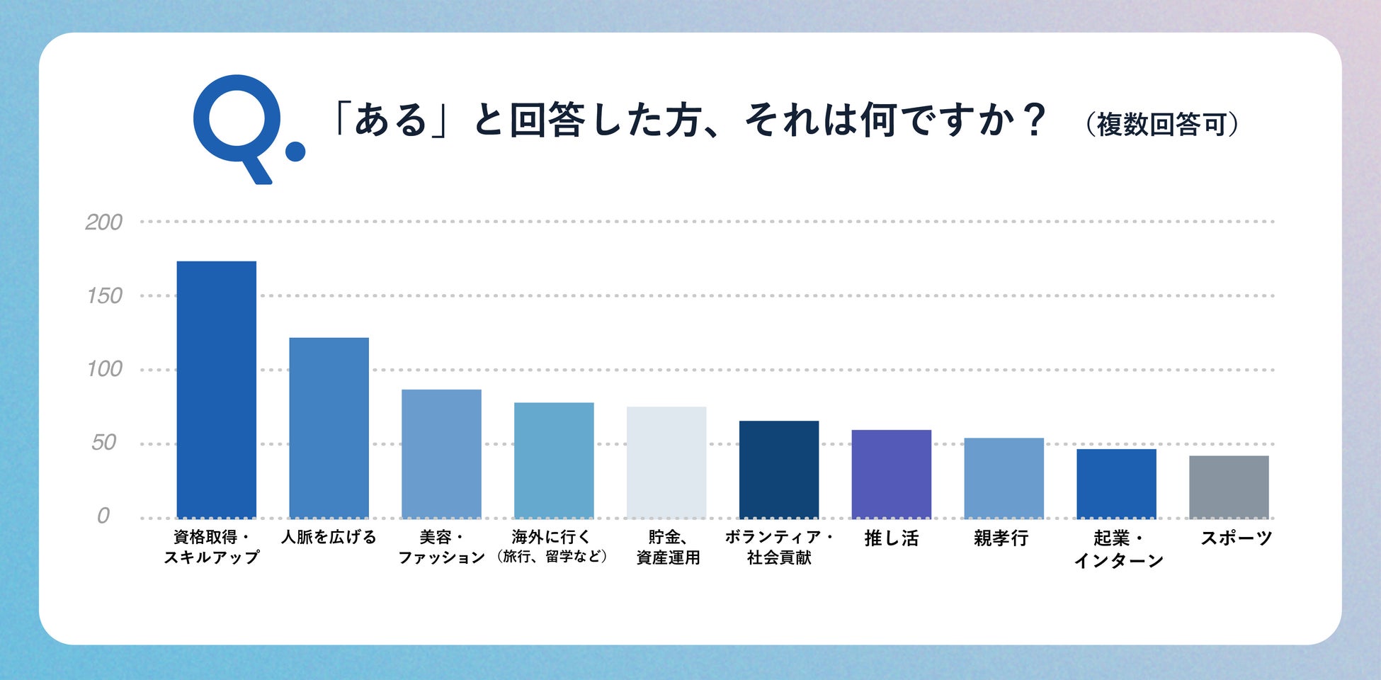 具体的には、資格取得やスキルアップ、人脈を広げることなど、自己研鑽に取り組みたいという声が多く寄せられました。新しい経験や学びを通じて、自身の可能性をさらに広げたいと考える新成人が多いことがうかがえる結果となりました。