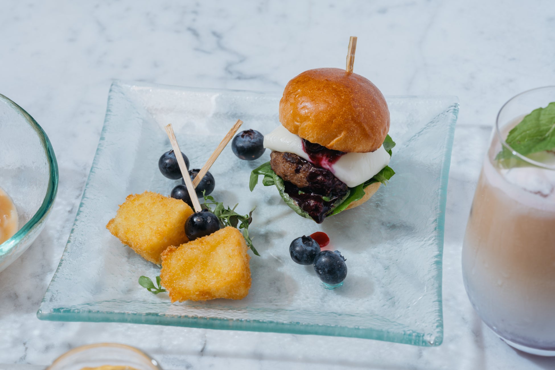 能登牛のパティにモッツァレラチーズ、ルッコラを合わせたスライダーバーガー。ほんのり甘いブルーベリーソースが旨味を引き立てる逸品です。