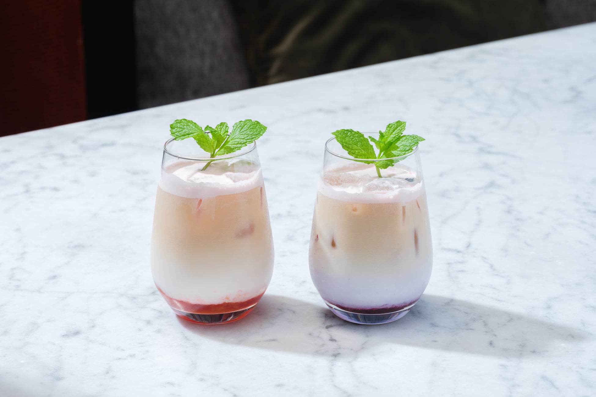 フルーツのコンフィチュール、ミルク、アールグレイ、ミルクのエスプーマを層を成すように注ぎ、塩キャラメルのシロップをアクセントに加えています。ピーチ、もしくはブルーベリーをお選びください。