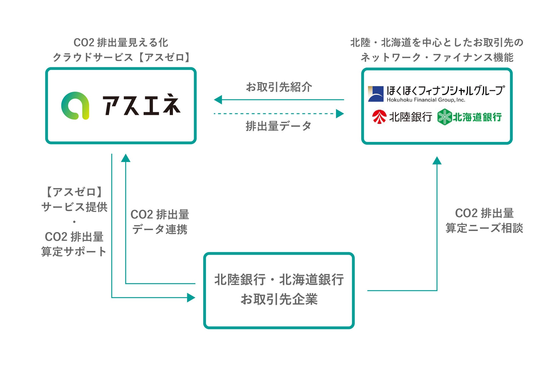CO2排出量見える化クラウドサービス【アスゼロ】を提供するアスエネ株式会社(本社:東京都港区、代表取締役CEO:西和田 浩平、以下「アスエネ」)は、ほくほくフィナンシャルグループの株式会社北陸銀行(頭取:庵 栄伸)および株式会社北海道銀行(頭取:兼間 祐二)とビジネスマッチング契約を締結しました。両行の取引先企業へアスゼロの提供を行い、地域企業の脱炭素経営を支援します。