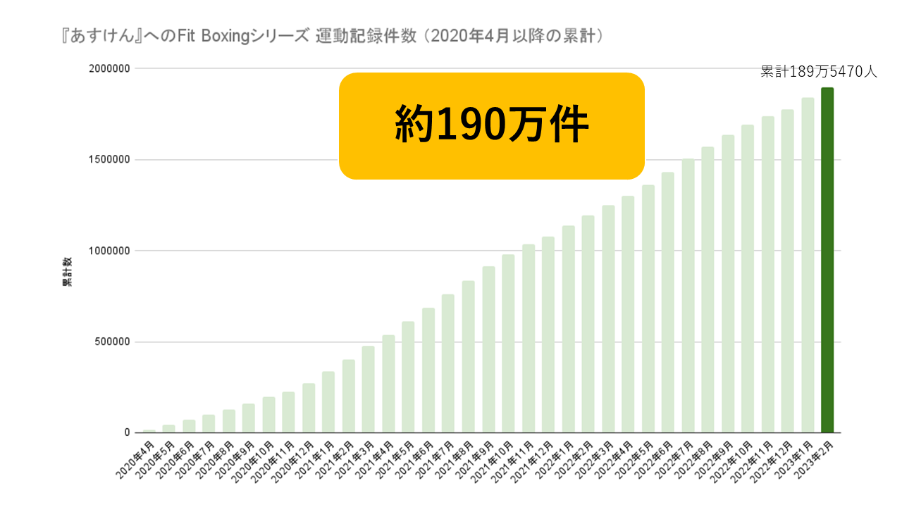 『Fit Boxing 2』の発売当初より、『あすけん』の運動メニューリスト内に『Fit Boxing 2』のプレイ内容を用意しており、ユーザーの皆さまが『Fit Boxing 2』でのトレーニング内容を簡単に『あすけん』へ登録し、食事記録や他の運動記録とともにカロリー管理・体重管理がしやすい環境を提供しています。2020年4月以降に『あすけん』に登録された『Fit Boxing』シリーズの運動記録件数の累計を調査したところ、約190万件となり、年々増え続けていることがわかりました。