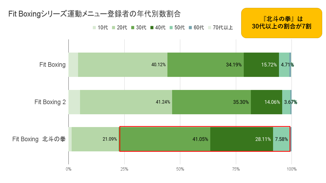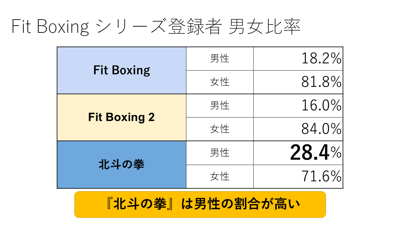 『Fit Boxing 北斗の拳』の運動メニューを記録しているユーザーの年代を調べたところ、30代以上が76.7%を占めており、これまでの『Fit Boxing』シリーズや『あすけん』利用者の年代別割合よりも、年代が高いユーザーが多く利用していることが伺えます。また、男女比率に関しては、シリーズ前作よりも男性の比率が16.0%から28.4%と、12ポイント増となっていました。このことから、特に30代以上の男性が『Fit Boxing 北斗の拳』を運動に活用していることが見て取れます。