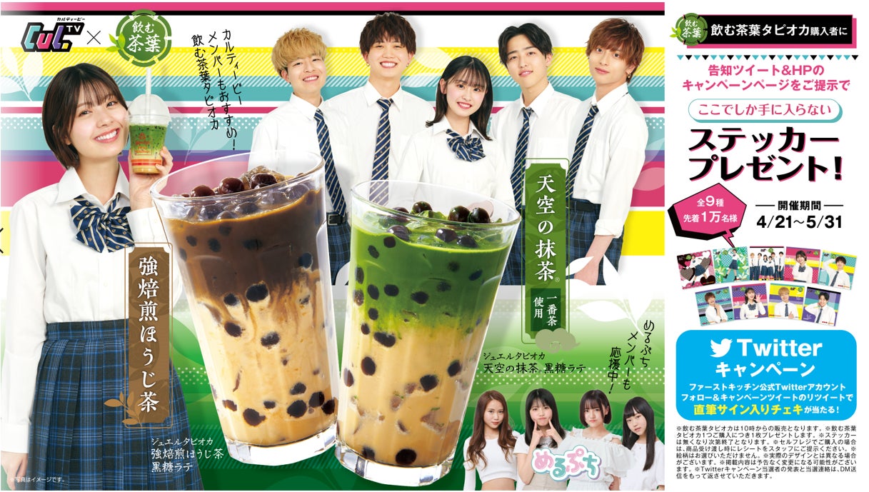 4月21日〜5月31日の期間には、「ゆな」ちゃんも在籍する人気インフルエンサーユニット「CulTV」とのコラボ企画として、店頭でジュエルタピオカ天空の抹茶Ⓡ黒糖ラテ、又はジュエルタピオカ強焙煎ほうじ茶黒糖ラテをお買い上げのお客様に「CulTVオリジナルステッカー」をプレゼントします。ウェンディ―ズ・ファーストキッチンでしか手に入らないCulTVメンバーのオリジナル撮りおろしステッカー全9種類(※1)です。また、4月24日(日)には、CulTVメンバーが渋谷センター街店の1日店長となり、メンバーのいずれかがレジにて注文を承るほか、商品やステッカーをお渡し(※2)します。東京・渋谷センター街店と大阪・梅田芝田町店の店内には期間中、CulTVメンバーの大型パネルなどを設置する予定で、この2店舗でしか味わえないCulTVの世界感をお楽しみいただけます。このほかCulTVの番組内では「飲む茶葉」シリーズと連動した企画を随時配信する予定です。詳しい最新情報は、ファーストキッチン公式Twitter(@FK_PR)をチェック!!