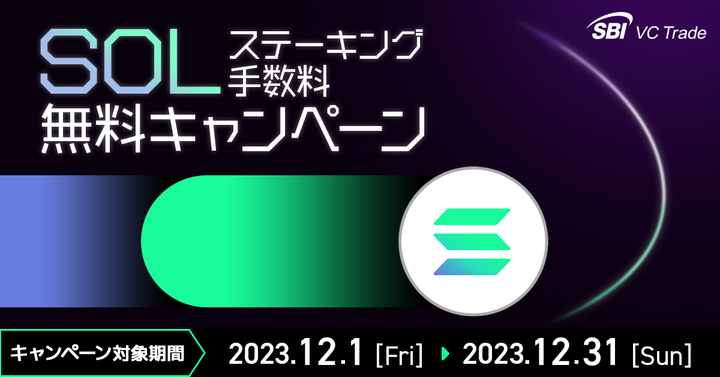 SBI VCトレード株式会社(本社:東京都港区、代表取締役社長:近藤 智彦、以下「当社」)は、ソラナ(SOL)の2023年12月分ステーキング手数料について無料キャンペーンを実施するとともに、キャンペーンに併せてソラナの入庫特別対応の最低入庫数量を引き下げることをお知らせいたします。