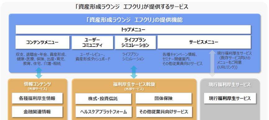 「エフクリ」は、企業の「従業員に対する資産形成支援など、自ら豊かな人生を送ることにつながる福利厚生制度を提供したい」というニーズと、従業員の「精緻な収支シミュレーションをベースに老後を含めたライフプランをデザインしたい」「ライフイベント時に最適なサポートを受けたい」というニーズ、双方に応える情報や商品・サービスを提供する国内初の資産形成プラットフォームです。
