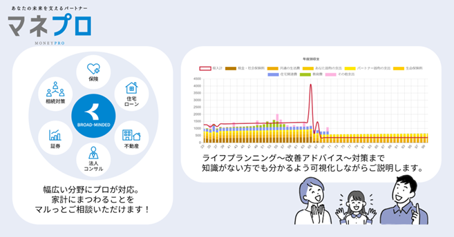 ブロードマインド株式会社は、保険・証券・住宅ローンなどの金融商品をワンストップで提供してきた中で、パーソナルファイナンスに関する幅広い情報・知見を有しているほか、年間2万件を超える相談に対し、ライフプランニングを通じてコンサルティングサービスを提供してきました。