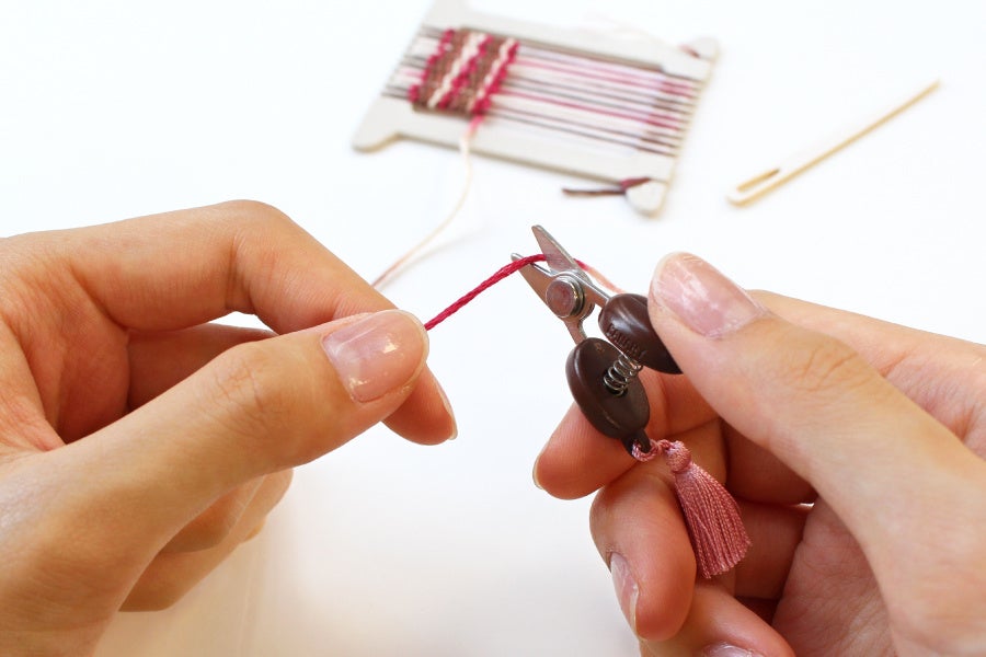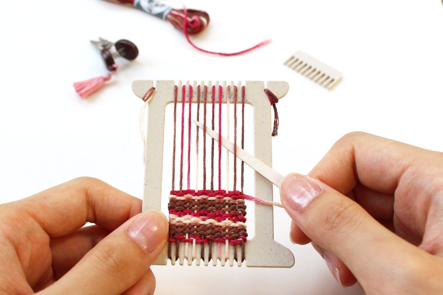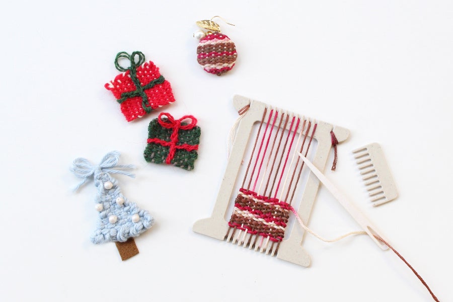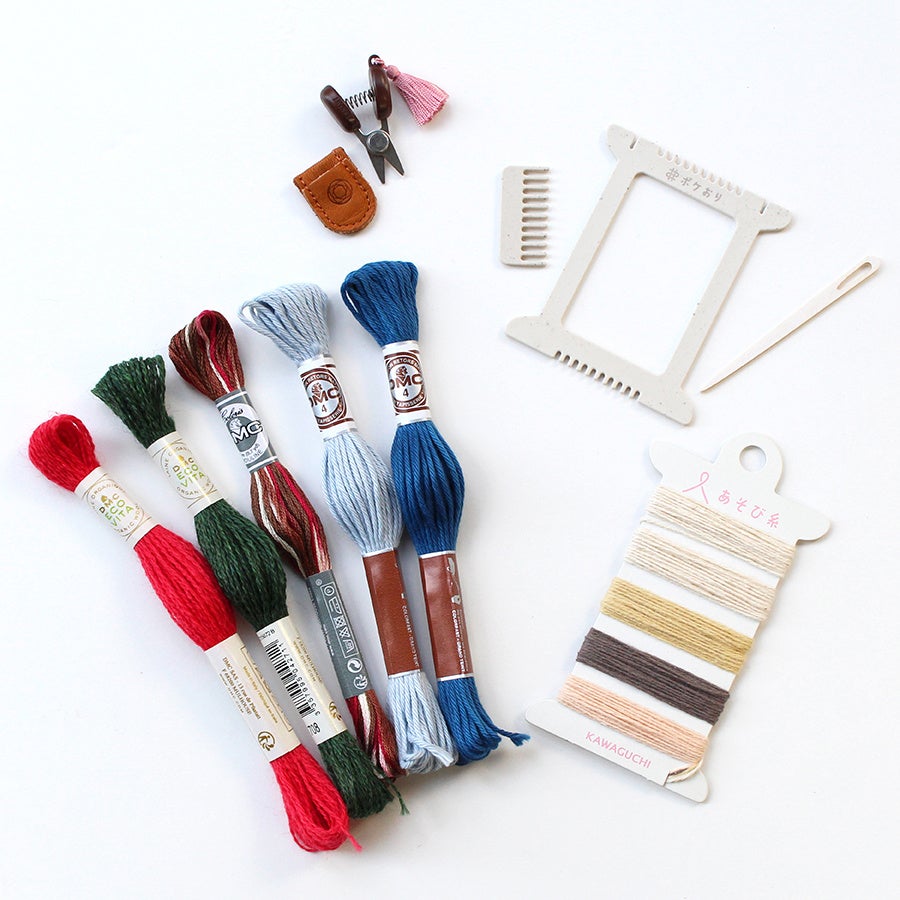 ポケットサイズのミニ織り機・くし・針とタテ糸が入っているので、すぐに織り始められます。