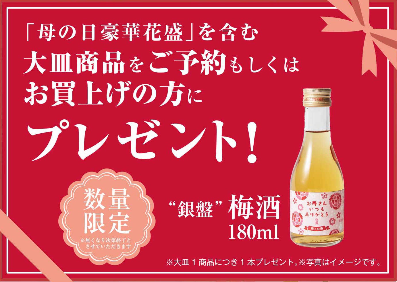 『母の日豪華花盛』を含む大皿商品をご予約・ご購入のお客様に、大皿商品1商品につき老舗酒造メーカー銀盤の「梅酒」をプレゼントいたします!!