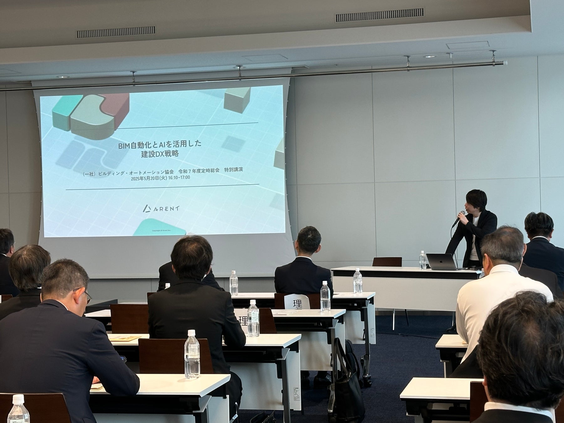 株式会社 Arent(本社:東京都港区、代表取締役:鴨林 広軌、以下 Arent)は、2025年5月20日に開催された一般社団法人ビルディングオートメーション協会(BA協会)令和7年度定時総会にて、代表取締役 鴨林 広軌が「BIM 自動化と AI を活用した建設 DX」をテーマに講演を行ったことをお知らせします。講演では、BIM と AI を組み合わせた現場での活用例や、導入初期から得られる改善効果を、具体的な事例を交えて紹介しました。