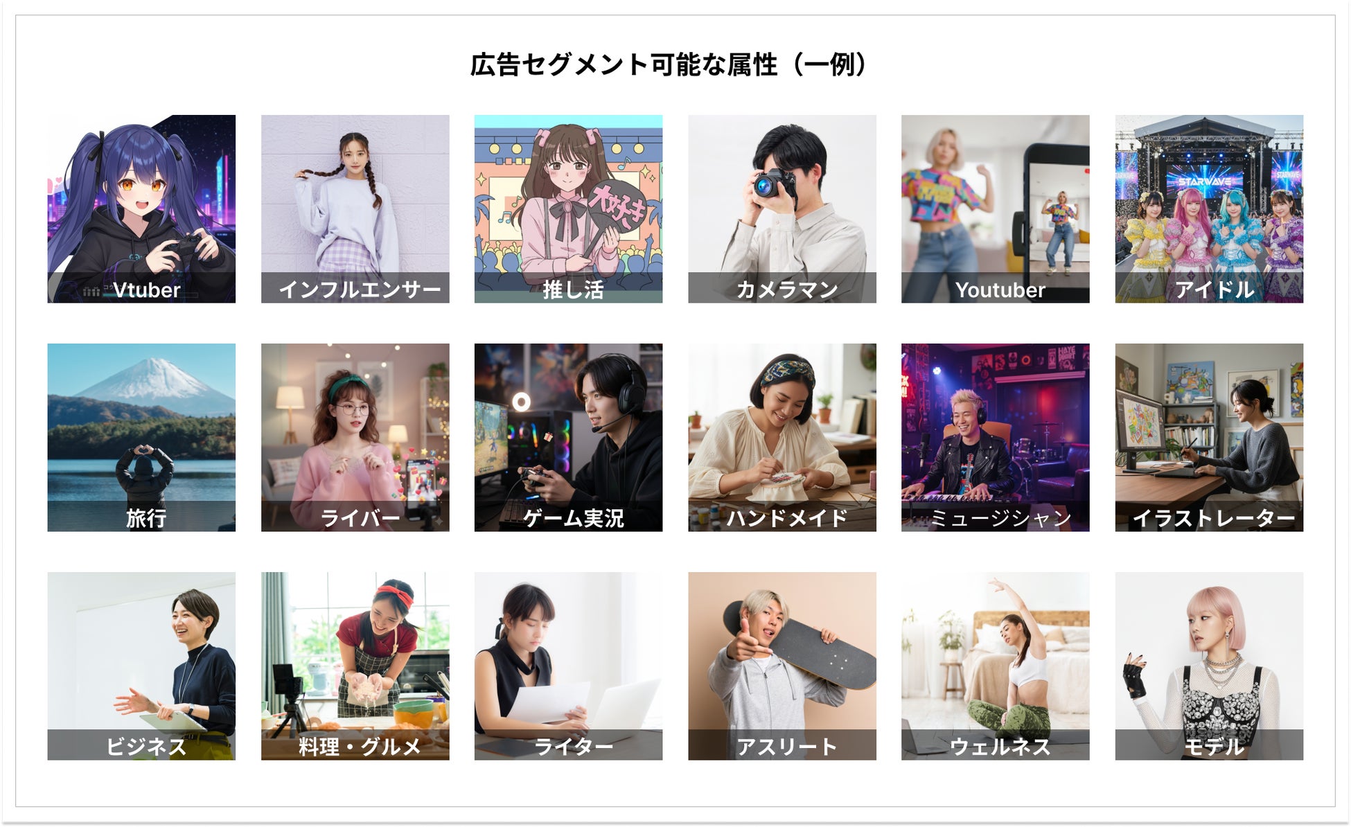 ターゲットとなるクリエイターの属性・活動内容・発信先に合わせてセグメントし、認知獲得から利用促進まで一貫した広告配信が可能です。 |