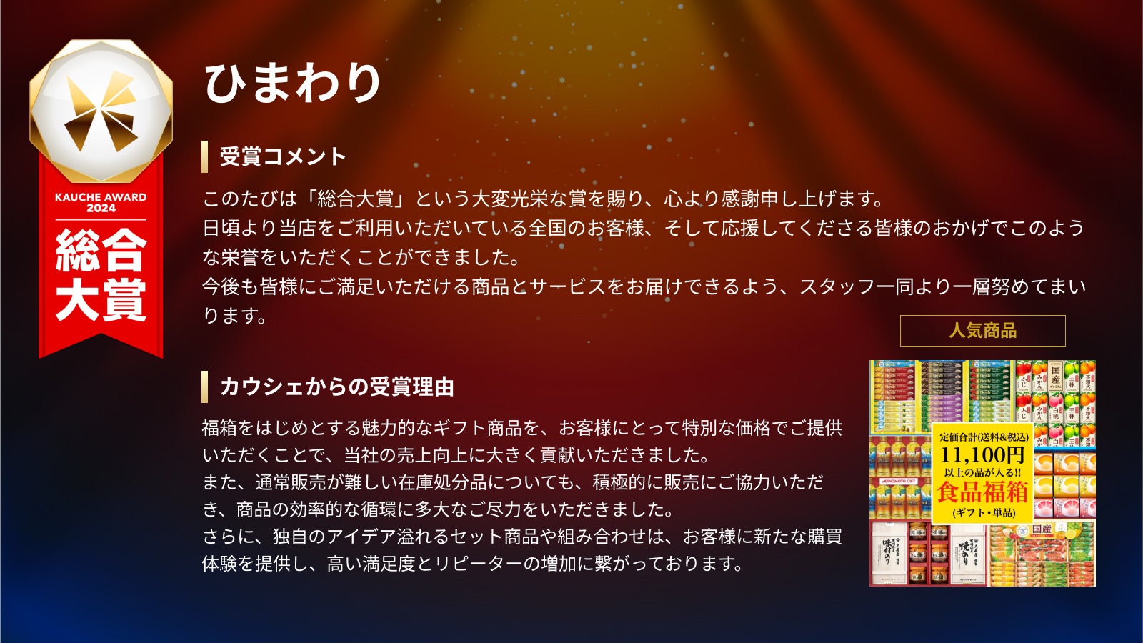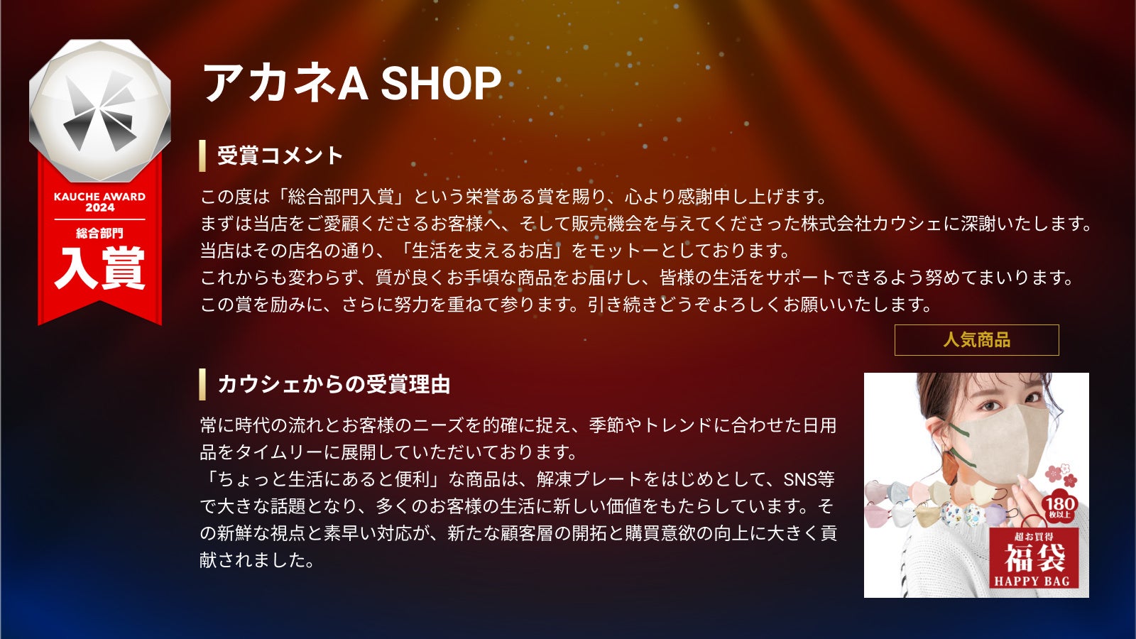 カウシェに出店する事業者の中で、売上、成長率、注文件数、お客様対応、お客様からの評価やリピート率などを、カウシェ独自の基準から総合的に評価し、表彰する部門です。