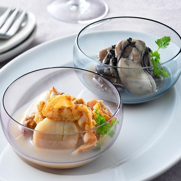 宮城県産の魚介の魅力を伝えたい!そんな情熱が宿る2品。宮城県沖で獲れたホタテと牡蠣を、古くから石巻の漁師に伝わる「潮煮製法」で仕上げている。塩や水すら使わず、それぞれの身からほとばしる潮のみで煮込んでいて、噛みしめると濃厚な旨みがジワッ。深い滋味に感動しきり。