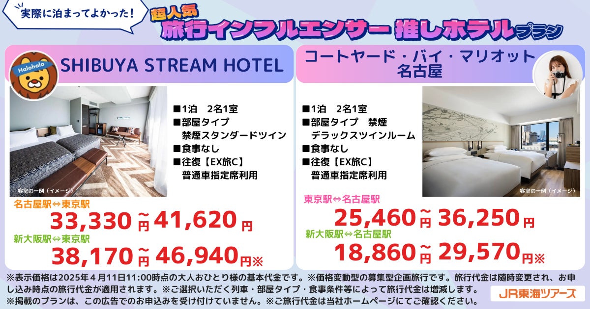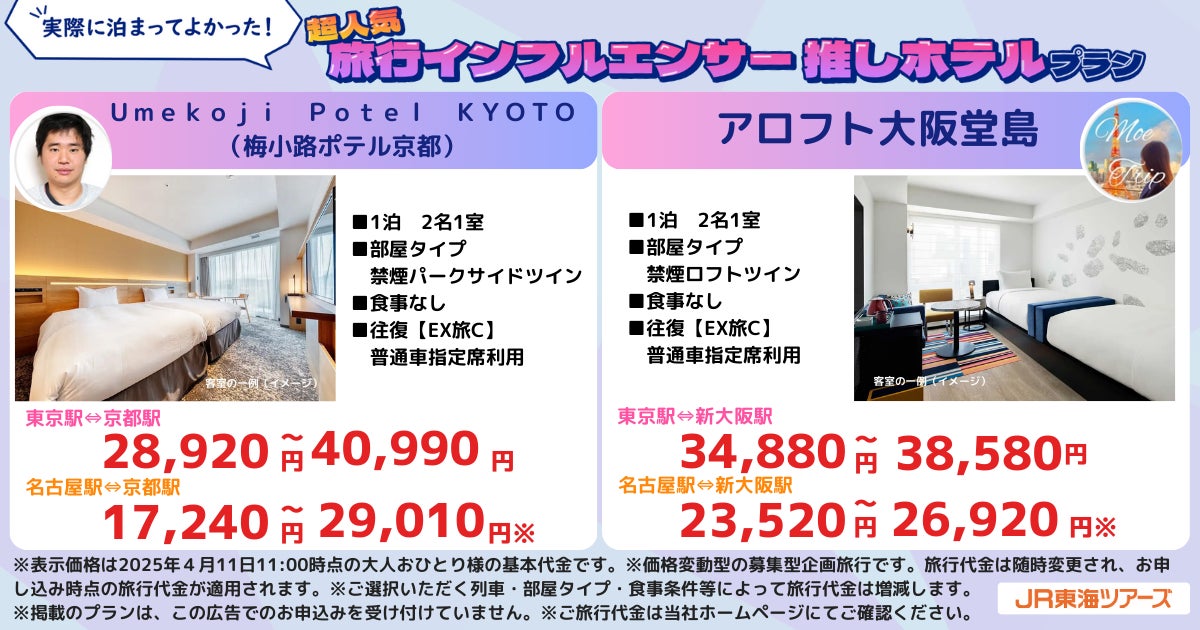 株式会社ジェイアール東海ツアーズ(本社:東京都中央区、以下JR東海ツアーズ)は、2025年4月11日(金)11時より、超人気旅行系インフルエンサーが厳選した「実際に泊まってよかった!推しホテル」と新幹線をセットにしたEX旅パック特別プランを発売いたしました。昨年に引き続き『Halohaloさん』と『もえさん』に加え、『SAORIさん』と『おのだ/Onodaさん』の計4名が、コスパ◎なホテルから一度は泊まってみたいラグジュアリーホテルやテーマパーク周辺のホテルまで幅広いランクから推しホテルを厳選し、おすすめポイントとともに紹介します。さらに、出発の30日前までの予約限定とすることで、お得な価格になりました。期間限定のこのチャンスをお見逃しなく。