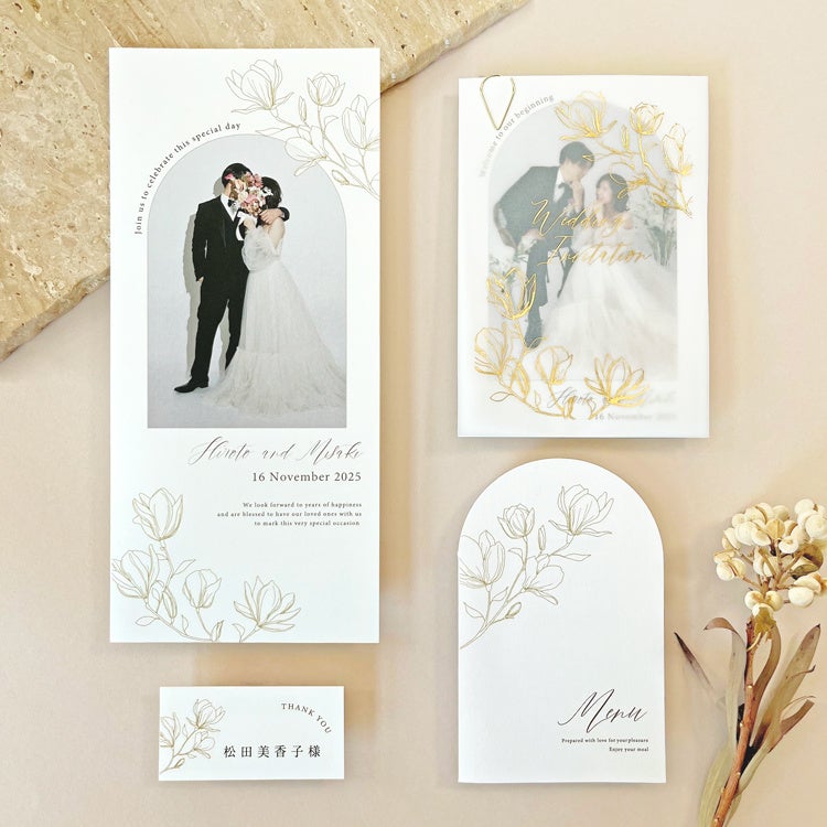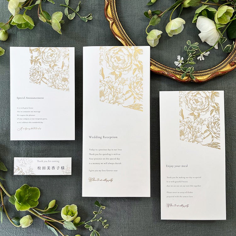 お花の部分には金箔印刷を施しているため華やかさもあり、まさにウェディングにぴったりです。
