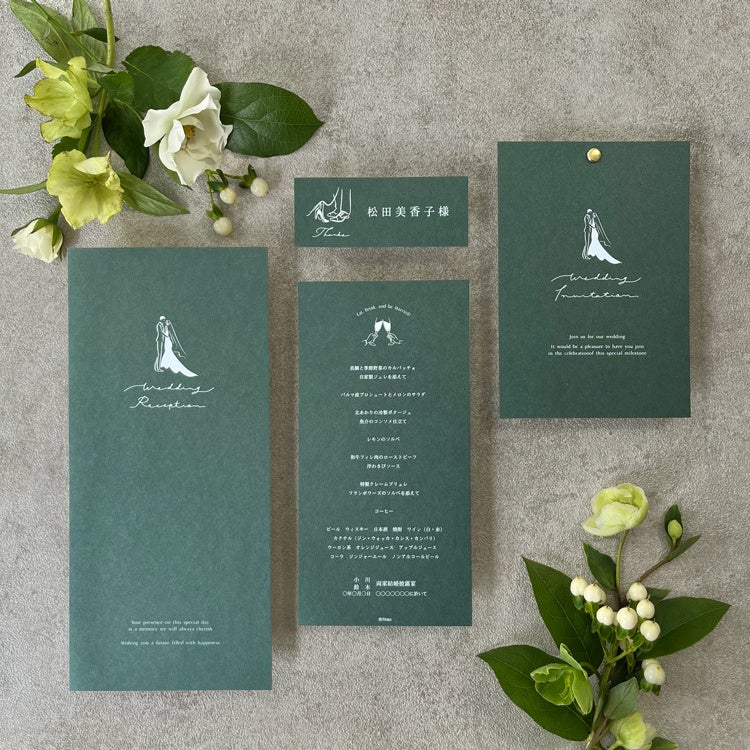 落ち着いたグリーン×イラストが、大人な雰囲気もありつつ、上品さを感じさせてくれるデザインです。