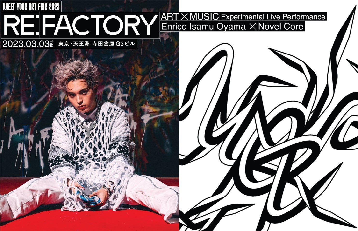 現代美術とストリートの領域を横断する活動で知られる大山エンリコイサム。アンダーグラウンドとメジャーという一見相反する特徴をたくみに兼ね揃えたNovel Core。その複合から生み出されるオリジナル性の高い表現を魅力とするふたりが、「RE:FACTORY」を舞台に交差し、一夜限りの実験的ライヴパフォーマンスを実施。Novel Coreの所属マネジメント/レーベル「BMSG」の理念に対する大山の共感をきっかけのひとつとする本コラボレーションは、「RE:FACTORY」のコンセプトである「ART×MUSIC」を象徴する取り組みとして、アートフェア初日の夜に特別開催。会場での観覧は完売しているが、「MEET YOUR ART(https://www.youtube.com/@MEETYOURART/)」にて生配信を実施。