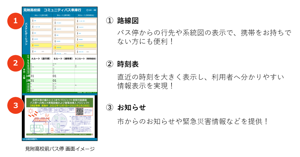 さらに、災害に強いバス停の実現に向け、行政情報や緊急災害情報などのリアルタイム発信が可能なスマートバス停(Type-B)でも「太陽光+蓄電池」で運用できるかを検証いたします。